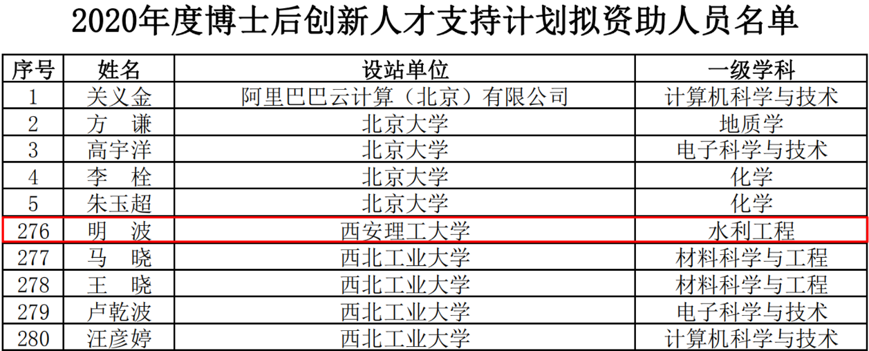 博士后创新人才支持计划,简称“博新计划”,是人力资源和社会保障部、全国博士后管委会新设立的一项青年拔尖人才支持计划,旨在加速培养造就一批进入世界科技前沿的优秀青年科技创新人才,是我国培养高层次创新型青年拔尖人才的又一重要举措。“博新计划”结合国家实验室等重点科研基地,瞄准国家重大战略、战略性高新技术和基础科学前沿领域,每年遴选400名应届或新近毕业的优秀博士,进入国内博士后设站单位从事博士后研究工作,国家给予每人63万元的经费支持。此次全国400名入选者中来自水利工程学科的仅5名,williamhill、清华大学、武汉大学、大连理工大学、河海大学各获选1名。