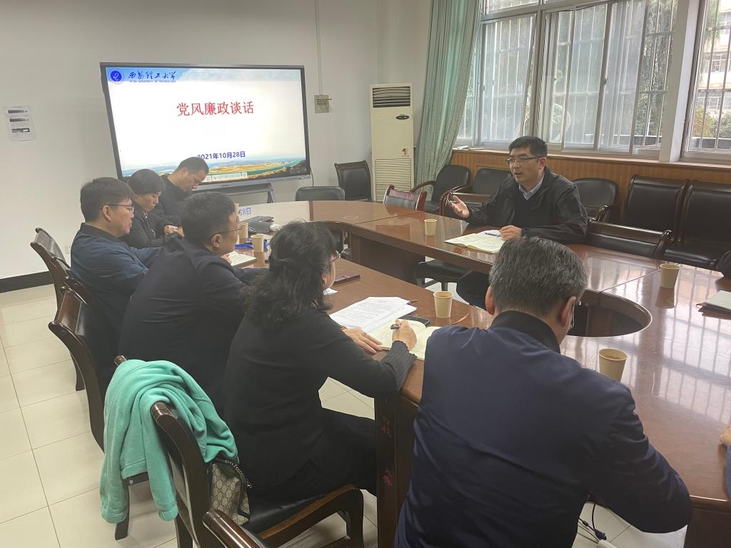 张晓晖首先从纪委工作职责谈起,要求学院班子成员准确理解监督执纪四种形态的重要内涵。他要求班子成员一是要谨记“八项规定”和“四风”的内涵和外延,并认真遵守;二是要认真学习学校下发的关于公司党委会、党政联席会的相关规定,遵守议事规则,严格按要求执行“三重一大”事项,规范信息公开;三是要认真履行“一岗双责”,将党风廉政建设与分管工作同谋划、同部署、同推进。同时,他对学院提出三点要求,一是认真学习党风廉政建设制度文件,提高思想认识和能力水平;二是详细梳理廉政风险点、排查重点岗位,尽快制定或完善防控机制;三是班子成员要以身作则,正确使用权力,主动接受监督。