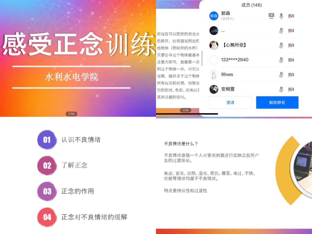 讲座中,郭森老师从专业的角度为大家阐明了“不良情绪、正念、冥想”等心理学概念,他结合当下疫情防控实际,用生动幽默的语言让员工感受和分析自我情绪,并学会用“正念”关注当下,而不做“好”与“坏”的评判。面对员工实际体验中的不良情绪,郭森给出几点建议:第一适当运动转移注意力,第二调节生物节律保障睡眠,第三直面情绪自我剖析。最后,在舒缓放松的音乐中,郭森带领全体同学初步感受正念训练,通过冥想的方式调节呼吸从而调整情绪和身体的状态,达到认清和接纳现实情况、缓解因环境而产生的焦虑和痛苦的目的。