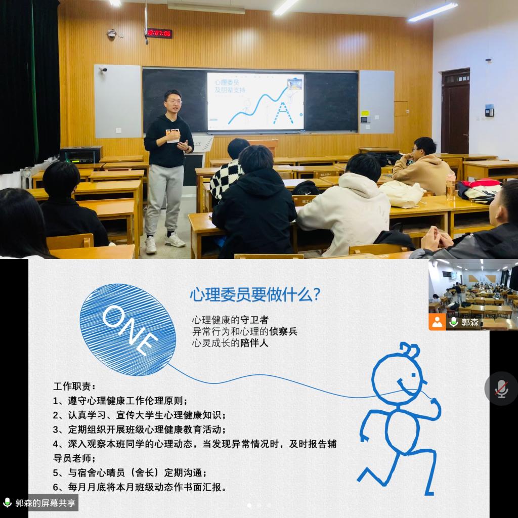 为充分发挥班级心理委员在心理健康教育四级网络工作中的基础作用,有效推进公司心理健康教育工作的开展,11月22日,公司设置线下线上同步直播,为全院的心理委员作主题为“心理委员及朋辈支持”的培训活动,培训由心理专干教师郭森主讲。