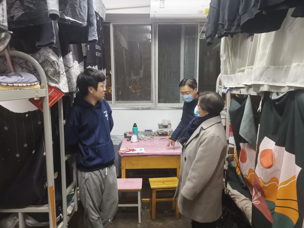在员工宿舍,李红英、吴罗长和杨帆与同学们亲切交谈,李红英在交谈过程中勉励毕业生找准自我定位,关注学院定点推送的就业信息,调整好心态积极就业;鼓励准备考试的员工认真复习,熟悉专业知识,顺利完成学业。吴罗长提醒同学们要遵守校园安全管理规章制度,坚持做好疫情防控工作,自觉维护宿舍安全、保持宿舍卫生整洁,积极营造安全、文明、健康、舒适的学习生活环境,携手共建文明校园。