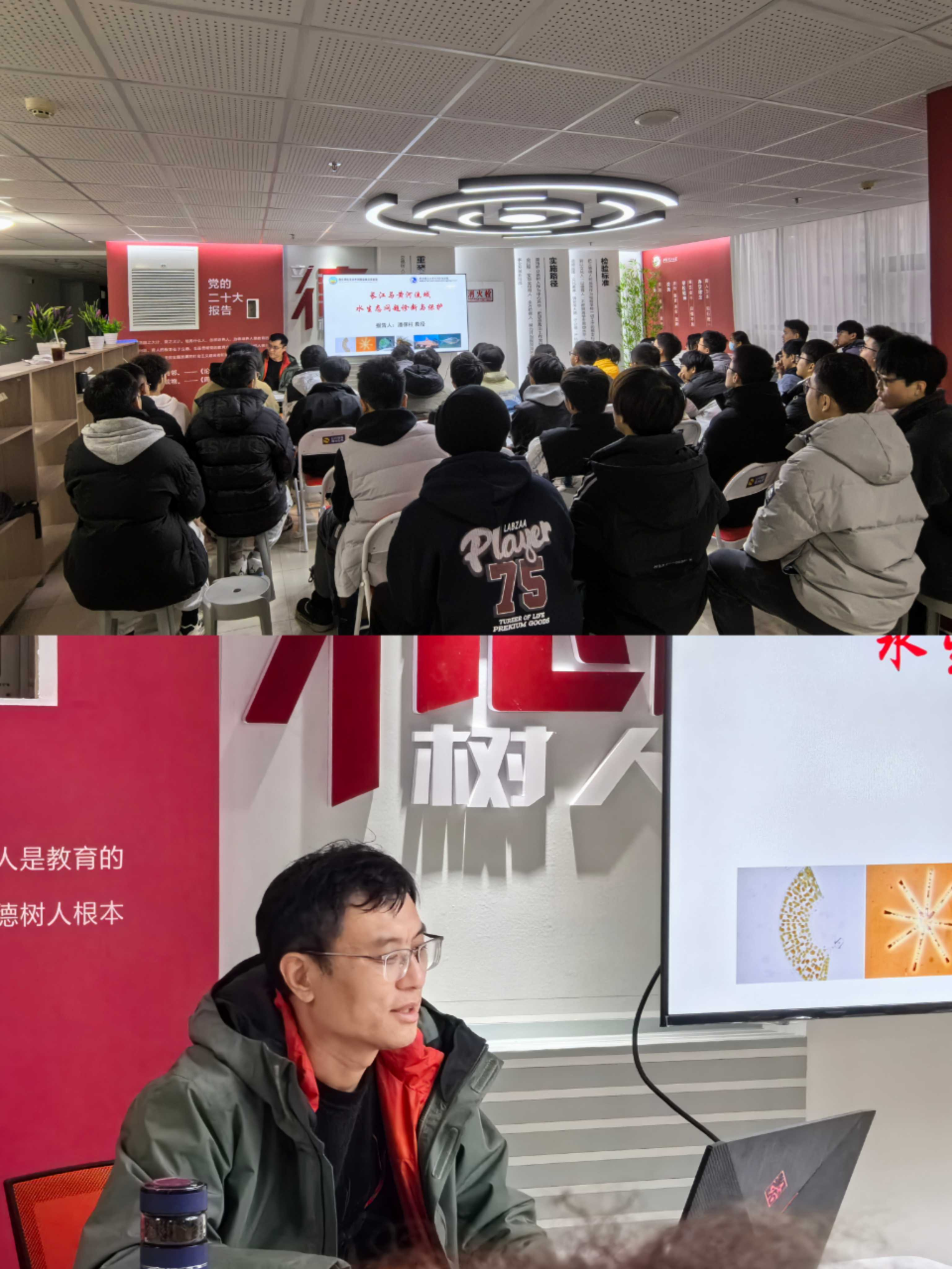 潘保柱教授以“长江与黄河流域水生态问题诊断与保护”为题,从科研定位、长江与黄河生态现状、典型区域存在问题等发面展开,运用生动的故事和通俗易懂的语言,为学院本科生重点介绍了黄河上中游水生态演变机制与修复关键技术,阐明了近四十年来黄河上中游水生态演变规律,揭示了流域泥沙与生源要素耦合生态效应。